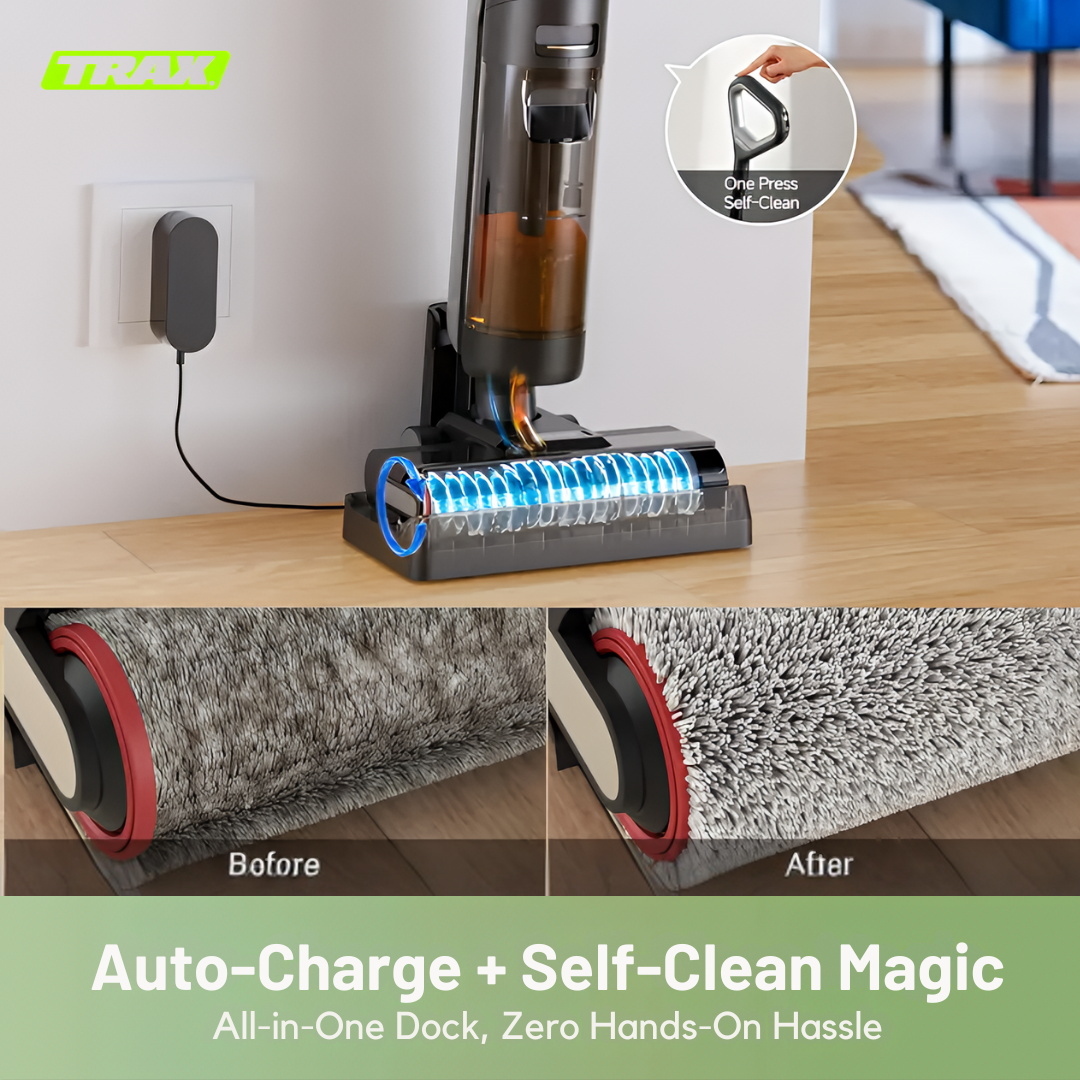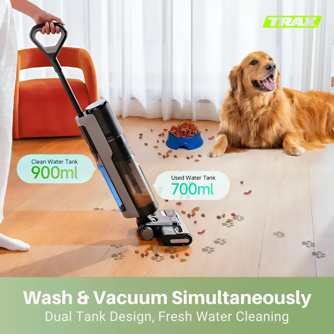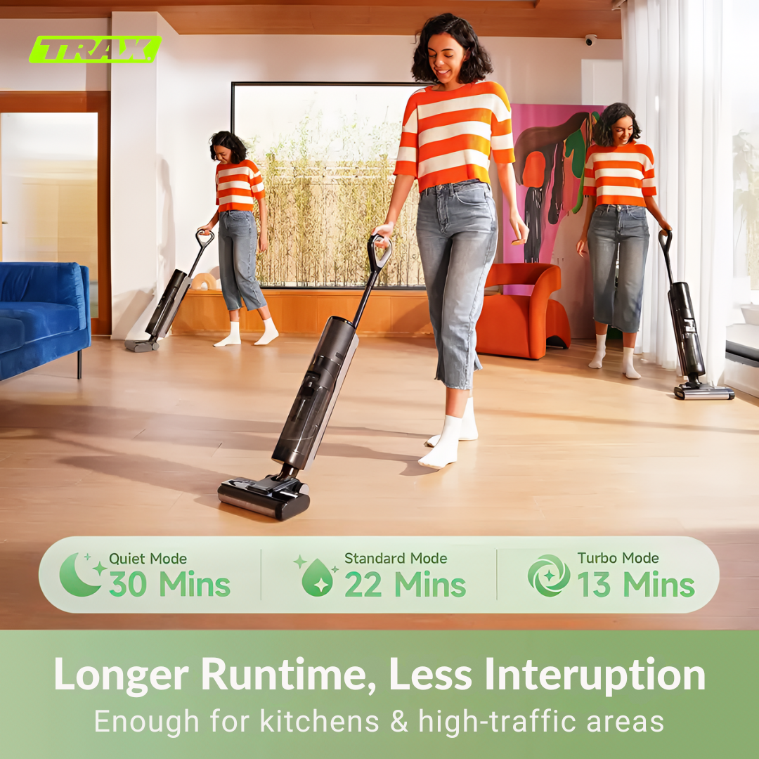 Powered by a long-lasting rechargeable battery, the TRAX GlidePro™ provides up to 30 minutes of continuous cordless cleaning. With its generous water tanks and efficient suction, it covers large floor areas without frequent refills or interruptions.
