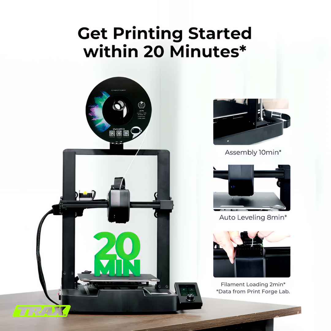 Just a few minutes. The TRAX PrintForge™ is engineered for hassle-free assembly, with a modular design and intuitive setup process. You’ll be ready to start printing quickly without complicated tools or lengthy preparation.
